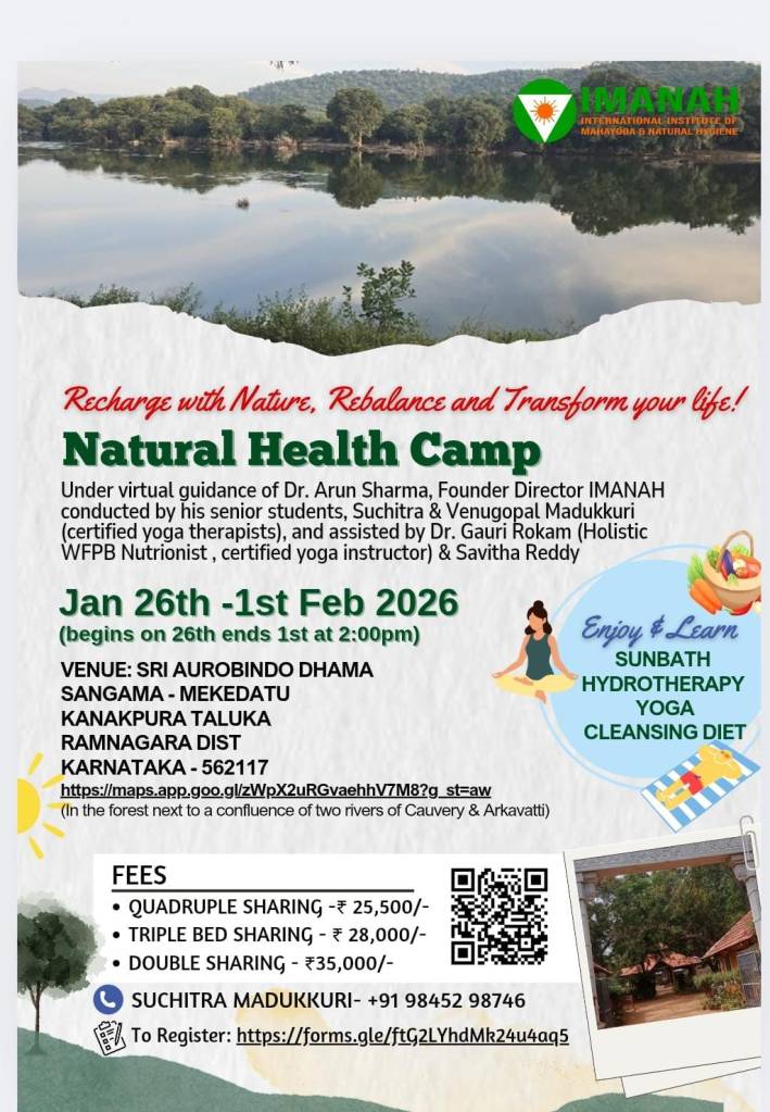 Join us to Learn and experience practically the teachings of the esteemed Dr. Arun Sharma, IMANAH USA’s Founder-Director, respected as a leading living guru in Nature Cure and the grandson of Acharya Lakshmana Sarma.